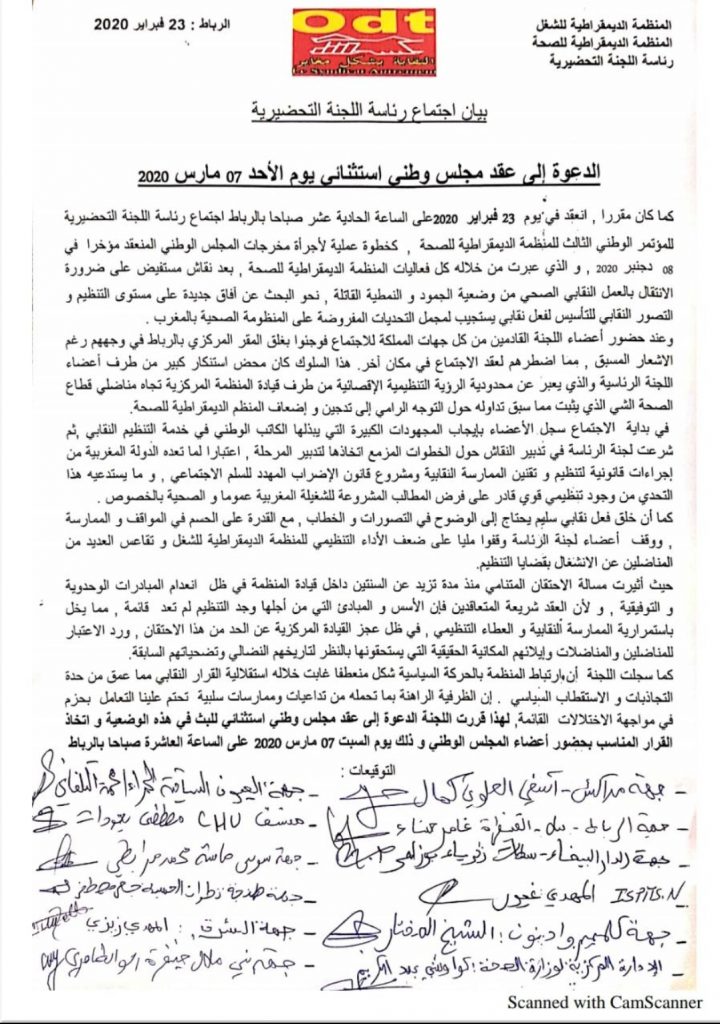 آخر تطورات ملف الاحتقان الذي تعرفه المنظمة الديموقراطية للشغل، و الأزمات التي تتخبط فيها قطاعاته، ومنها المنظمة الديموقراطية للصحة، التي تخوض هذه الأيام أشكالا من النضال السياسي، جراء المشاكل التي يعاني منها قطاع الصحة، والتي تعزيها المنظمة، إلى السياسة المركزية الفاشلة، وسوء تدبير القطاع من طرف القيادة المركزية.