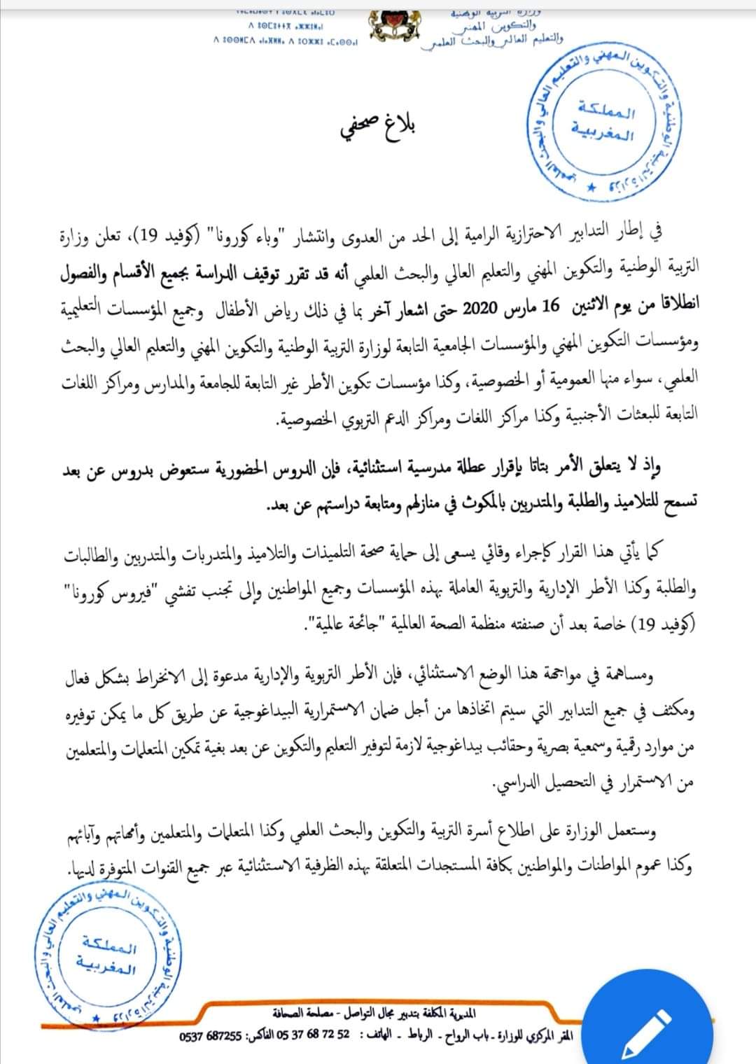 أصدرت وزارة التربية الوطنية والتكوين المهني والتعليم العالي والبحث العلمي بالمغرب بلاغا يقضي بتعليق الدراسة بجميع المؤسسات التعليمية والمهنية، الغامة والخاصة، وذلك ابتداء من يوم الاثنين 16 مارس 2020 حتى اشعار آخر، حفاظا على سلامة التلاميذ والأطر، بسبب انتشار وباء كورونا.