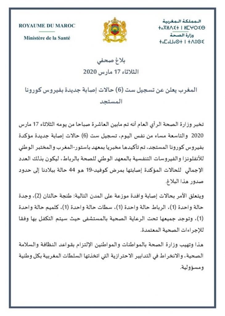 ست حالات إصابة جديدة مؤكدة تنضاف الى الحصيلة السابقة للمصابين بفيروس كورونا المستجد، حسب ما أعلنت عنه وزارة الصحة في بلاغ صحفي اليوم الثلاثاء 17 مارس2020.