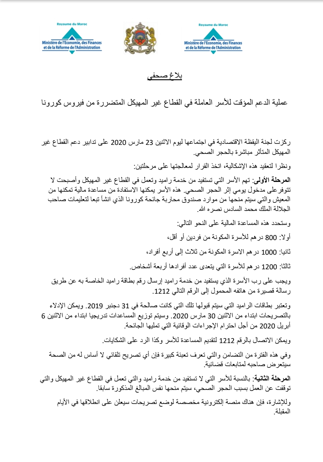 و المرحلة الثانية ستشتغل لجنة اليقظة على تصور معلوماتي وتقني بغاية تيسير استفادة الأسر التي لاتستفيد من نظام راميد من الدعم المؤقت المعلن عنه. إذ أكدت اللجنة أنها ستعلن عن الصيغة قبل نهاية الأسبوع المقبل.
