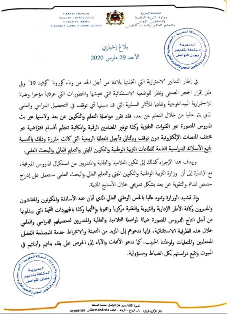 وجاء في بلاغ لها ، أنه سيتم متابعة الدروس المصورة عبر القنوات التلفزية، وكذا توفير المضامين الرقمية وإمكانية تنظيم أقسام افراضية عبر مختلف المنصات الإلكترونية دون توقف. وذلك لتمكين التلاميذ والطلبة والمتدربين من استكمال الدروس المبرمجة، مع الإشارة إلى أن الوزارة ستعمل على إدراج حصص للدعم والتقوية عن بعد بشكل تدريجي خلال الأسابيع المقبلة.