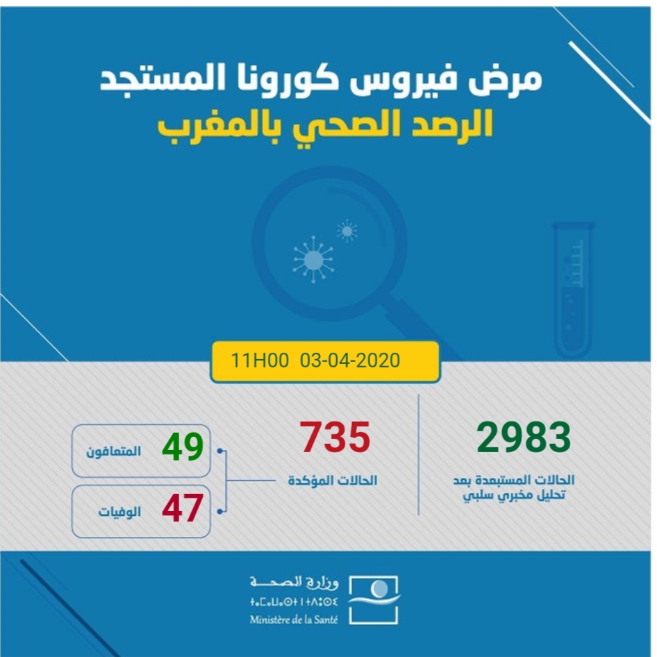 ولم تسجل وزارة الصحة، لحدود الساعة، أية حالة وفاة جديدة، ليبقى العدد مستقرا في حدود 47 حالة.