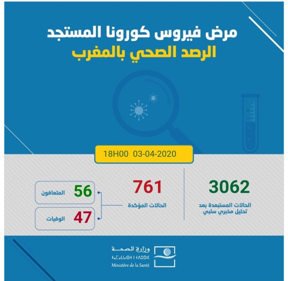 وذكرت الوزارة أن عدد الحالات المستبعدة، بلغت 3062 بعد تحاليل مختبرية سلبية، وذلك منذ بداية انتشار الفيروس. في حين وصل عدد المتعافين من فيروس “كورونا” في المغرب، إلى 56 حالة، متجاوزا عدد الوفيات الذي بلغ 47 حالة.
