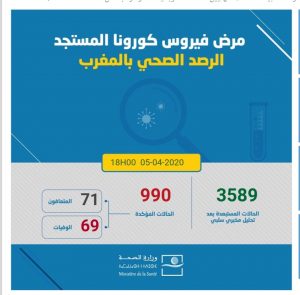 أعلنت وزارة الصحة، مساء اليوم الأحد 5 أبريل، تسجيل 107 حالات إصابة مؤكدة جديدة بفيروس كورونا المستجد خلال الـ24 ساعة الماضية، ليرتفع عدد المصابين بكوفيد 19، إلى 990 حالة. بينما وصل عدد الحالات المستبعدة، إلى 3589 بعد تحاليل مختبرية سلبية.