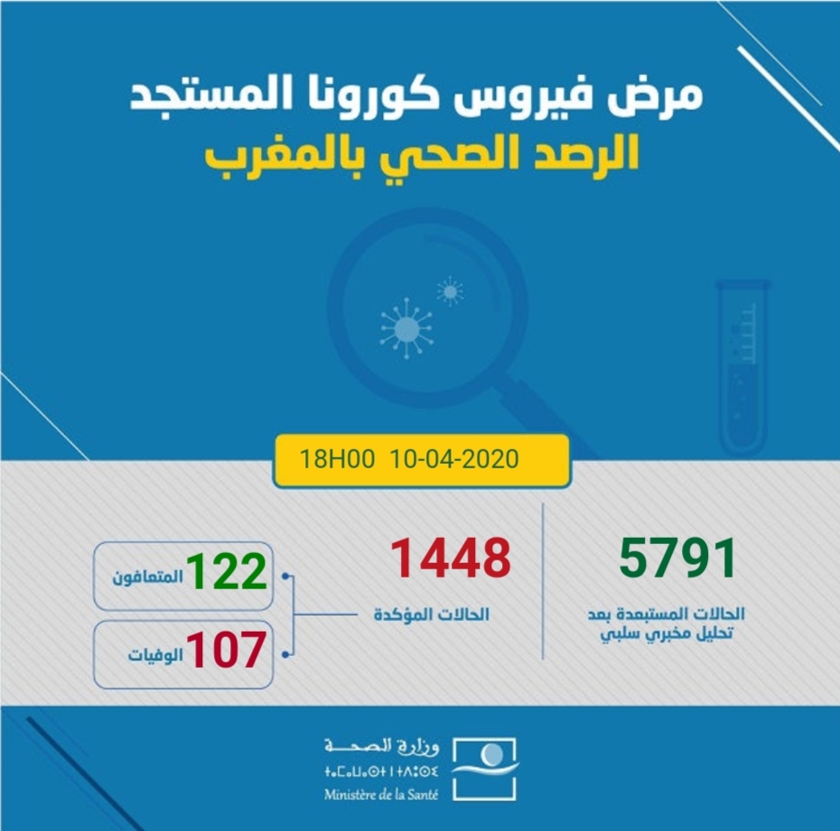 وحسب ذات المصدر، فقد تم تسجيل 10 حالات وفاة جديدة، ليصل العدد الإجمالي للوفيات إلى 107 حالة، فيما تم تسجيل 13 حالة شفاء جديدة ليرتفع العدد الإجمالي للحالات 122 حالة شفاء.