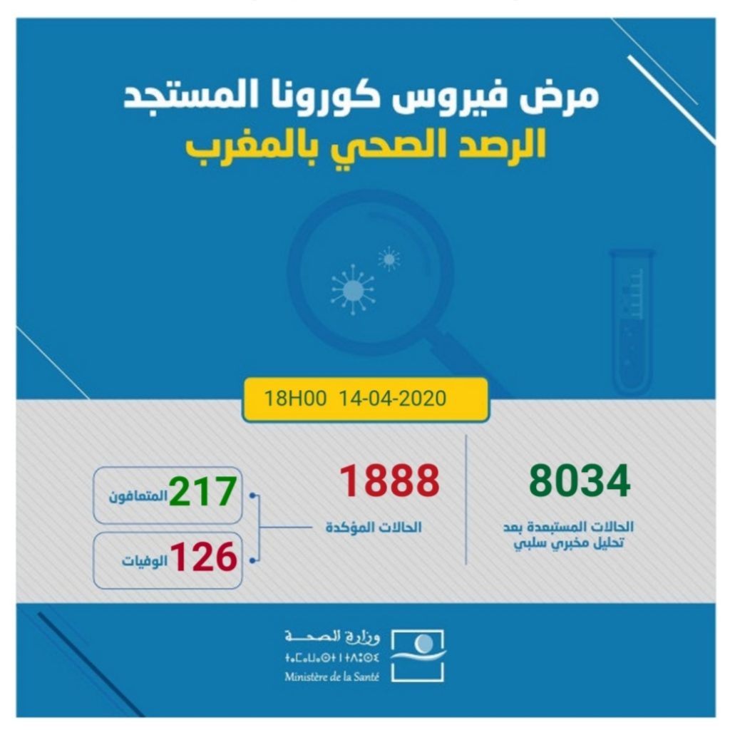 وأفاد محمد اليوبي، مدير مديرية علم الأوبئة ومكافحة الأمراض بوزارة الصحة، أن عدد الحالات المستبعدة، بعد تحاليل مختبرية سلبية، بلغت 8034 حالة فيما لم يتم تسجيل أي حالة وفاة خلال الـ24 ساعة الماضية ليبقى العدد الإجمالي للوفيات 126 حالة إلى حدود السادسة من مساء اليوم؛ بينما تم تسجيل 14 حالة شفاء جديدة، ليرتفع عدد الحالات التي تماثلت للشفاء إلى 217 حالات.