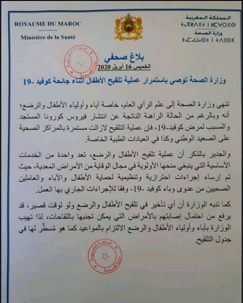 أخطرت وزارة الصحة، آباء وأولياء الأطفال والرضع أن عملية التلقيح لازالت مستمرة بالمراكز الصحية العمومية على الصعيد المملكة، وكذا في العيادات الطبية الخاصة.