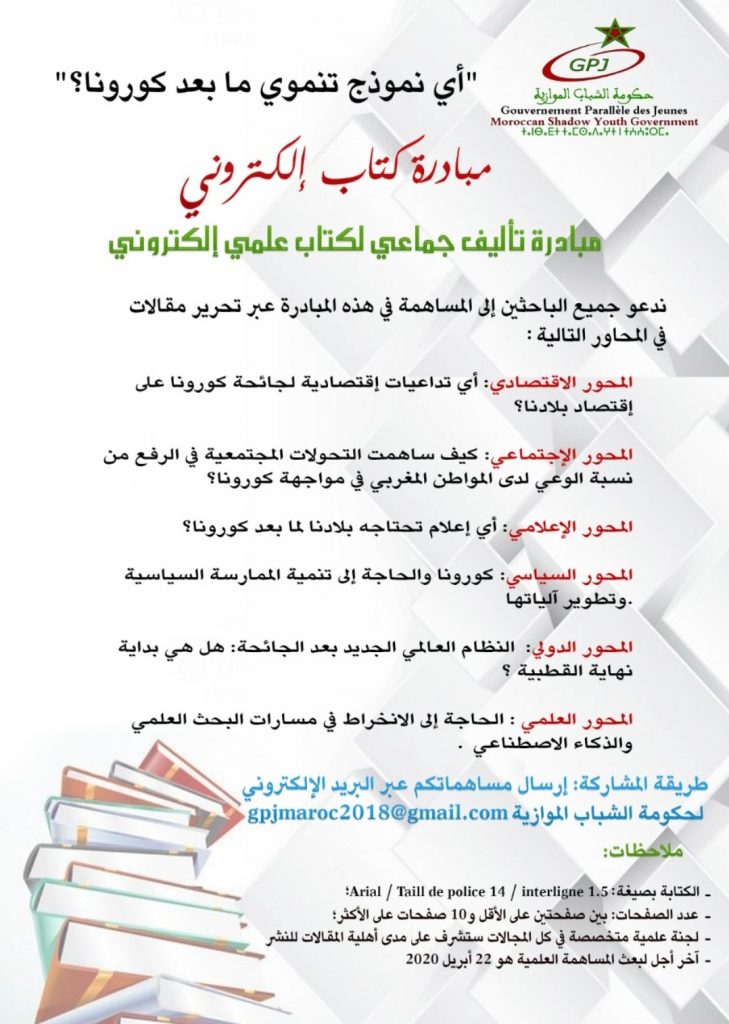 أعلنت حكومة الشباب الموازية عن إطلاق مبادرة لتأليف كتاب إلكتروني جماعي بعنوان “أي نموذج تنموي ما بعد كورونا؟”، وذلك في سياق مواكبتها للإجراءات التي اتخذتها المملكة لمكافحة جائحة فيروس كورونا المستجد (كوفيد-19).
