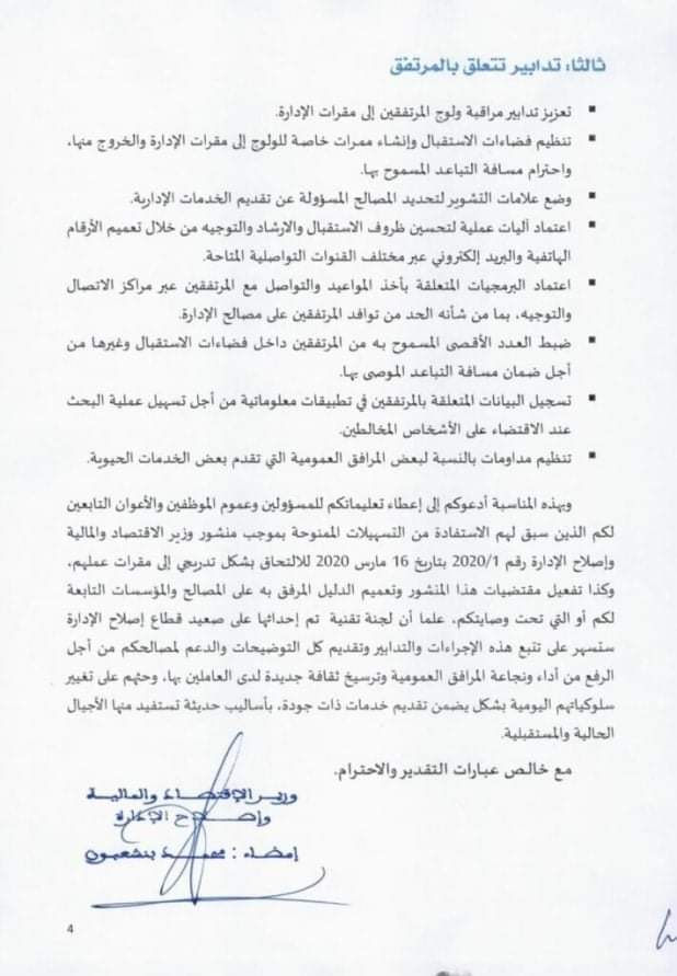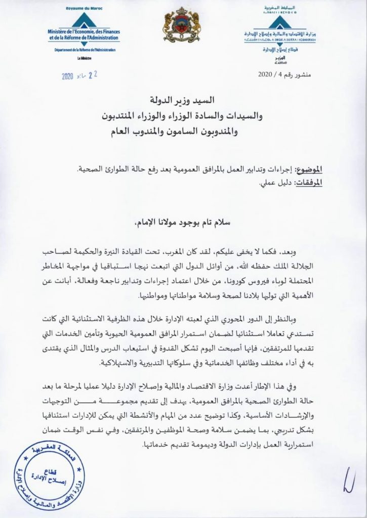 وأوضحت الوزارة أن ” السيد محمد بنشعبون، وزير الاقتصاد والمالية وإصلاح الإدارة، أصدر منشورا رقم 4/2020 بتاريخ 22 ماي 2020 ، حول إجراءات وتدابير العمل بالمرافق العمومية بعد رفع حالة الطوارئ الصحية، والذي يدعو فيه مسؤولي وموظفي وأعوان الإدارات العمومية، الذين سبق لهم الاستفادة من التسهيلات الممنوحة بموجب منشور السيد الوزير رقم 1/2020 بتاريخ 16 مارس 2020، للالتحاق بشكل تدريجي إلى مقرات عملهم، وتفعيل مقتضيات هذا المنشور، وتعميم وتطبيق الإجراءات والتدابير التي تم حصرها في دليل تم إعداده لهذه الغاية”.