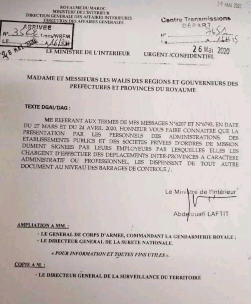 وحسب مراسلة موجهة لعمال وولاة أقاليم المملكة من طرف وزير الداخلية عبد الوافي، أن مسؤولي الادارات والمؤسسات العمومية والشركات الخاصة يمكنهم التنقل دون الحاجة لوثيقة السماح بالتنقل من العمالة وإنما أصبحت وثيقة ” الأمر بالمهمة” كافية للتنقل بين العمالات لاسباب ادارية او مهنية.