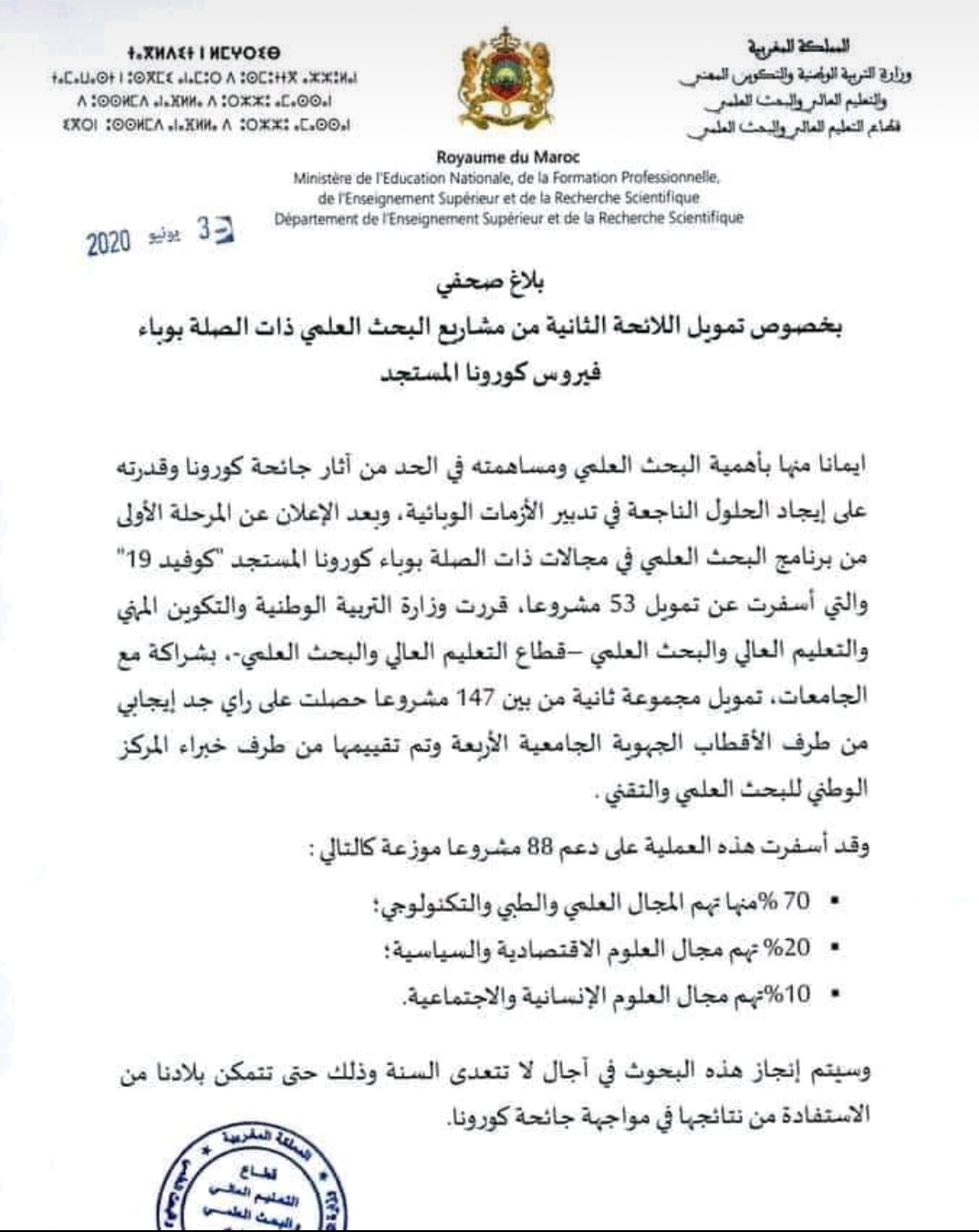 وجاء في البلاغ الذي توصلنا بنسخة منه، أنه بعد الإعلان عن المرحلة الأولى من برنامج البحث العلمي في مجالات ذات صلة بوباء كورونا المستجد، التي أسفرت عن تمويل 53 مشروعا، تقرر بشراكة مع الجامعات تمويل مجموعة ثانية من بين 147 مشروعا حصلت على رأي جد إيجابي من طرف الأقطاب الجهوية الجامعية الأربعة وتم تقييمها من طرف خبراء المركز الوطني للبحث العلمي والتقني.