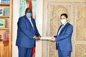 سفير جنوب السودان، ريك بيوك ريك (يسار) خلال تقديم نسخة من أوراق اعتماده لناصر بوريطة وزير الخارجية