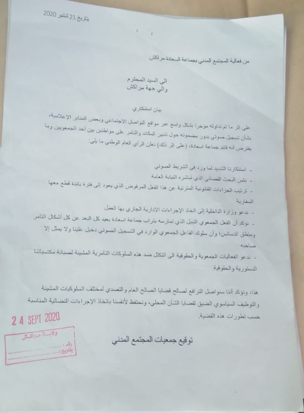ودعت الفعاليات المذكورة وزارة الداخلية، في بيانها، الذي حصلنا على نسخة منه، إلى اتخاذ الإجراءات الإدارية الجاري بها العمل بخصوص النازلة، مؤكدا أن الفعل الجمعوي النبيل الذي تمارسه (الجمعيات) بتراب جماعة سعادة بعيد كل البعد عن كل أشكال التآمر ومنطق الدسائس، وأن سلوك الفاعل الجمعوي الوارد في التسجيل الصوتي “دخيل علينا ولا يمثل إلا صاحبه”.