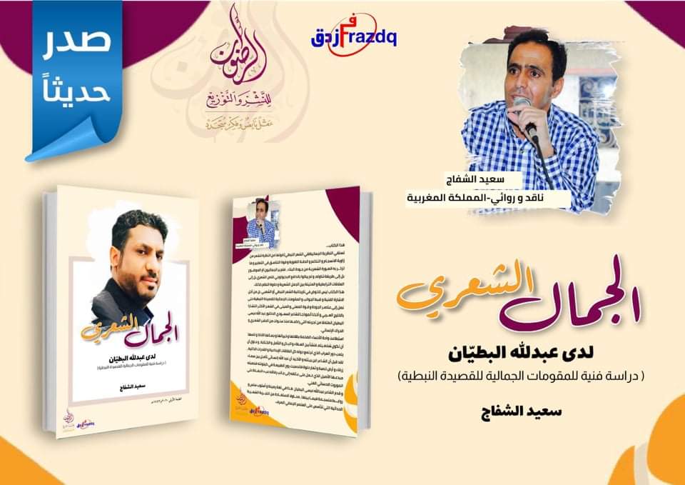 عن مركز الرضوان للنشر و التوزيع، صدر للناقد و الروائي المغربي سعيد الشفاج، كتابا نقديا بعنوان “الجمال الشعري لدى عبد الله البطيان (دراسة فنية للمقومات الجمالية للقصيدة النبطية)”. و يأتي هذا الاصدار في إطار المقاربة النقدية الجمالية لأحد أهم الالوان الشعرية بالخليج العربي ألا و هو الشعر النبطي، حيث عمد الكاتب سعيد الشفاج إلى تفكيك العناصر و المقومات الجمالية للنص الشعري النبطي و استند على تجربة الشاعر عبد الله عيسى البطيان كأنموذج.