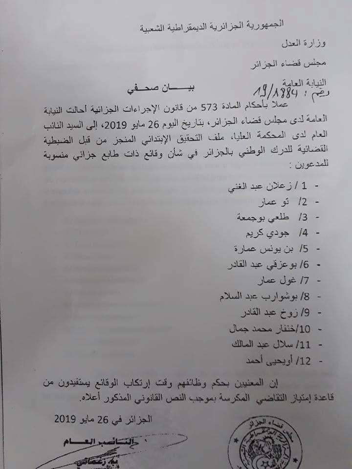 أفادت وسائل إعلام دولية أن النيابة العامة الجزائرية أحالت ، اليوم الأحد26 ماي 2019، تسعة وزراء ورئيسي حكومة سابقين للمحكمة الجزائية العليا ، من أجل التحقيق معهم في قضايا ذات طابع جزائي.