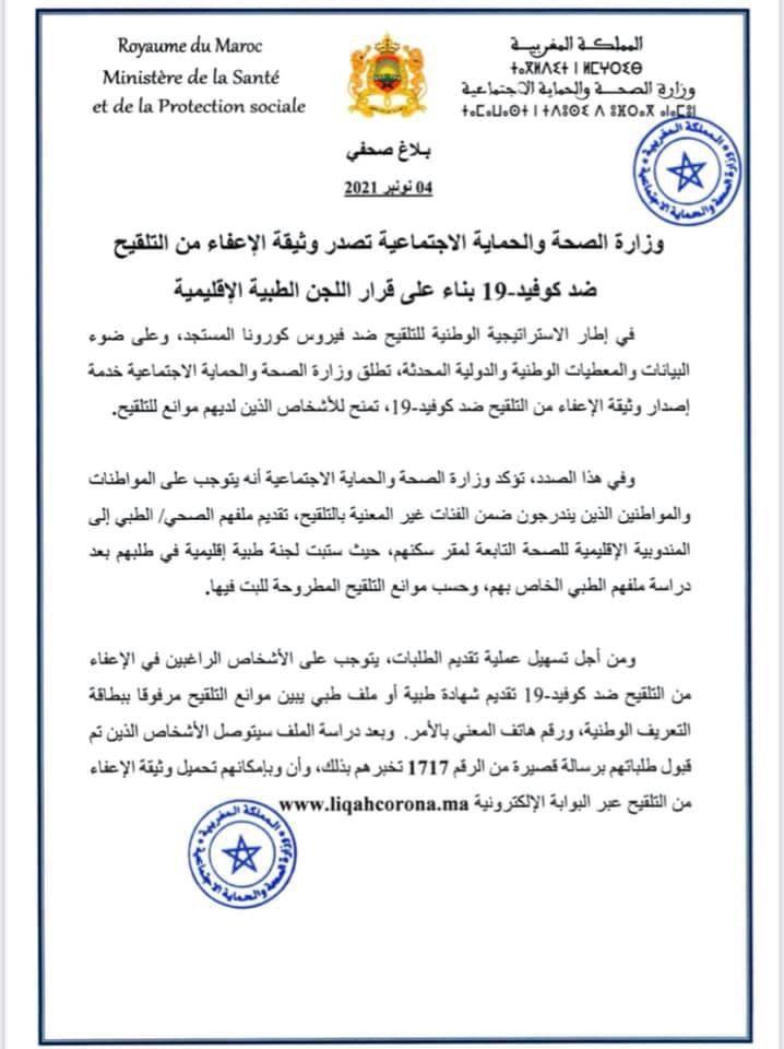 أعلنت وزارة الصحة والحماية الاجتماعية، اليوم الخميس 04 نونبر 2021 ، عن إطلاق خدمة إصدار وثيقة الإعفاء من التلقيح ضد كوفید-19، تمنح، بناء على قرار اللجان الطبية والإقليمية، للأشخاص الذين لديهم موانع للتلقيح، وذلك في إطار الاستراتيجية الوطنية للتلقيح ضد فيروس كورونا المستجد، وفي ضوء البيانات والمعطيات الوطنية والدولية المحدثة.