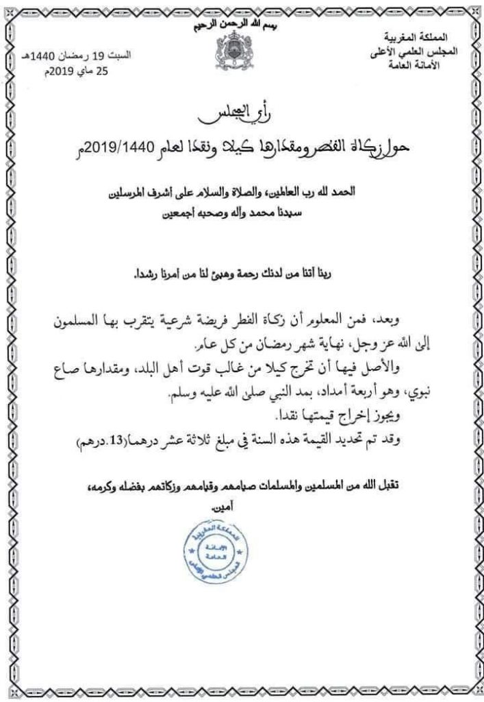 وأضاف المجلس أنه يجوز إخراج قيمتها نقدا ؛ وقد تم تحديد القيمة هذه السنة في مبلغ ثلاثة عشر درهما (13 درهم).