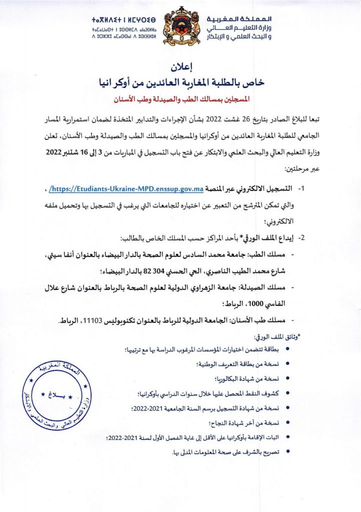 أعلنت وزارة التعليم العالي والبحث العلمي والابتكار عن فتح باب التسجيل في المباريات الخاصة بالطلبة المغاربة العائدين من أوكرانيا، المسجلين بمسالك الطب والصيدلة وطب الأسنان، من 3 إلى 16 شتنبر 2022.