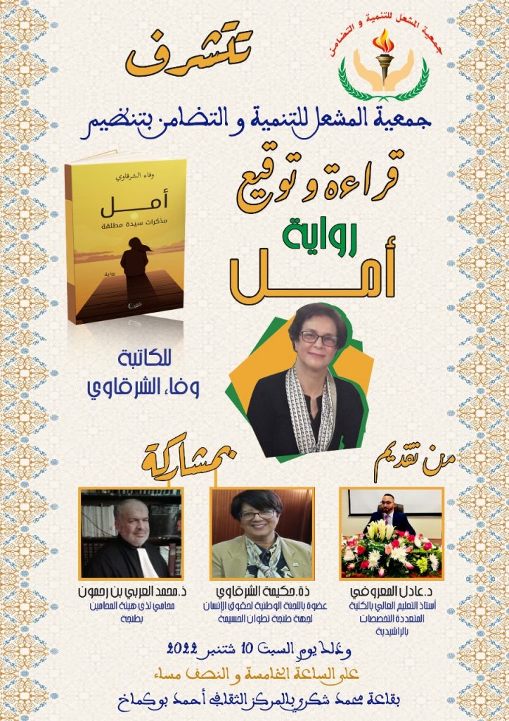سيتم يوم السبت 08 شتنبر 2022،بقاعة محمد شكري، بالمركز الثقافي أحمد بوكماخ بطنجة، في الساعة الخامسة والنصف بعد الزوال ، قراءة وتوقيع رواية “أمل”، للكاتبة وفاء الشرقاوي بمشاركة الأساتذة:عادل المعروفي، حكيمة الشرقاوي ومحمد العربي برحمون.