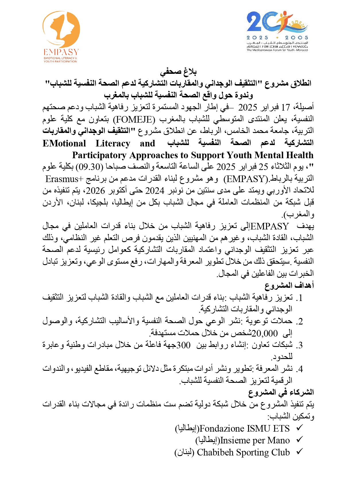في خطوة تهدف إلى تعزيز رفاهية الشباب ودعم صحتهم النفسية، أعلن المنتدى المتوسطي للشباب بالمغرب (FOMEJE)، بشراكة مع كلية علوم التربية بجامعة محمد الخامس بالرباط، عن انطلاق مشروع “التثقيف الوجداني والمقاربات التشاركية لدعم الصحة النفسية للشباب” (EMPASY).
