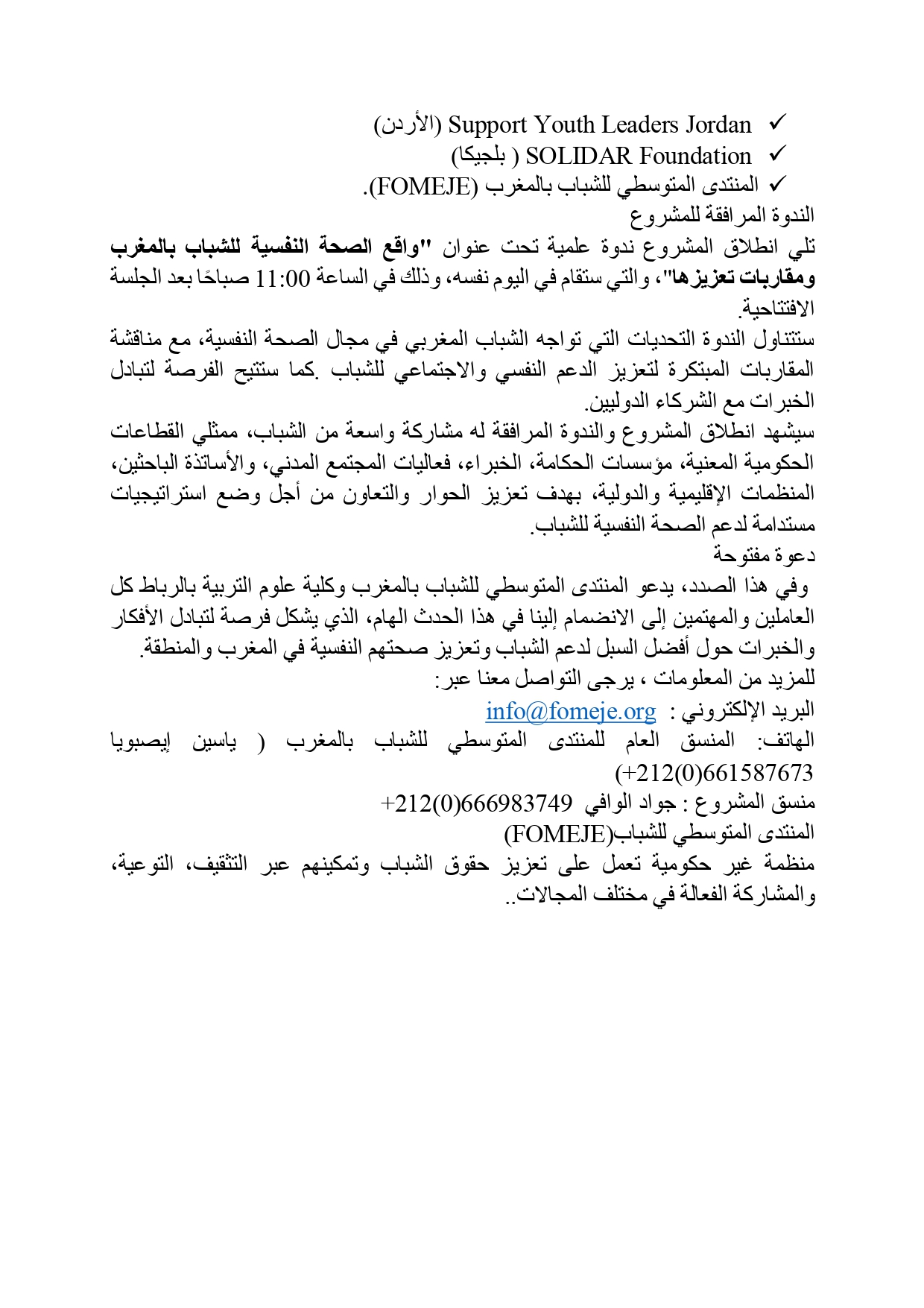 وفي هذا الإطار، يدعو المنتدى المتوسطي للشباب بالمغرب وكلية علوم التربية جميع المهتمين للمشاركة في هذه المبادرة الهامة والمساهمة في دعم صحة الشباب النفسية بالمغرب والمنطقة.