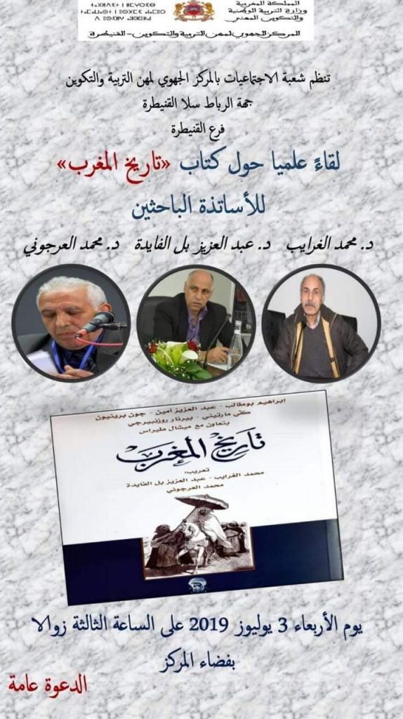 تنظم شعبة الاجتماعيات بالمركز الجهوي لمهن التربية والتكوين ، جهة الرباط سلا القنيطرة ، فرع القنيطرة، لقاء علميا حول كتاب “تاريخ المغرب” للأساتذة الباحثين :د.محمد الغرايب ،د. عبد العزيز بل الفايدة ود.محمد العرجوني، يوم الأربعاء 03 يوليوز 2019، في الساعة الثالثة زوال بفضاء المركز.