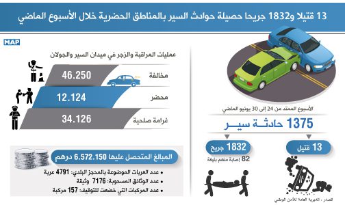 (و م ع) لقي 13 شخصا مصرعهم، وأصيب 1832 آخرون بجروح، إصابات 82 منهم بليغة، في 1375 حادثة سير داخل المناطق الحضرية خلال الأسبوع الممتد من 24 إلى 30 يونيو 2019.