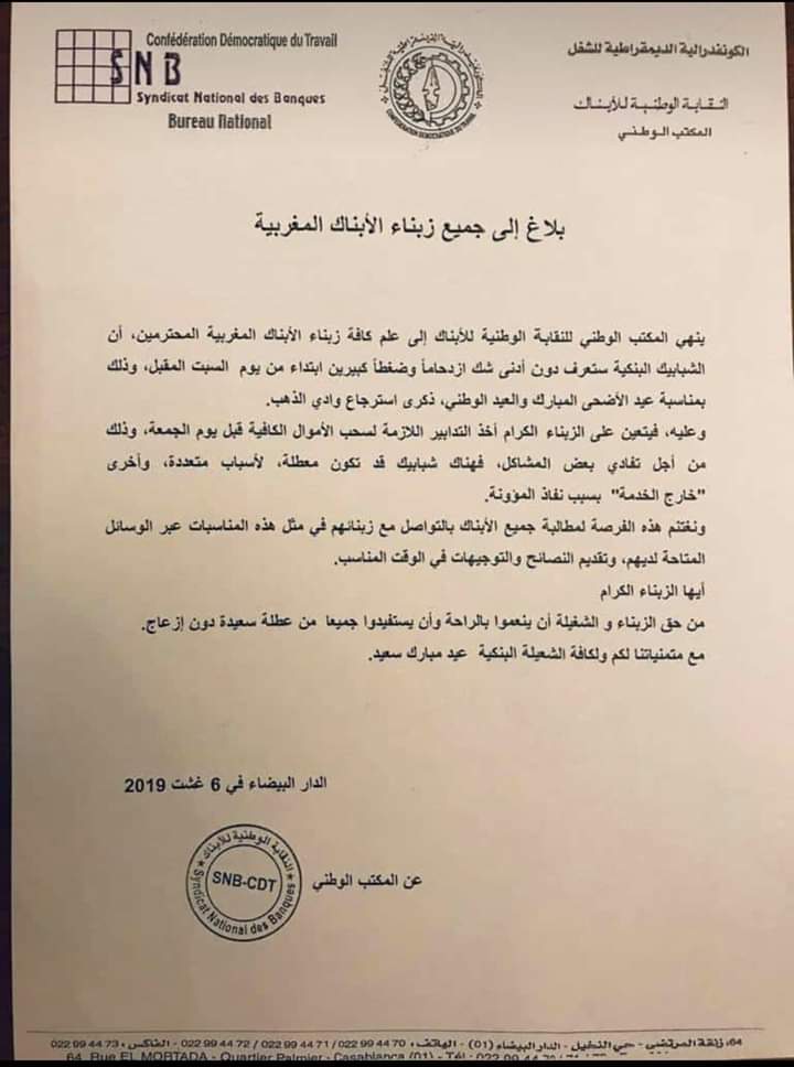 لذلك أصدر المكتب الوطني للنقابة الوطنية للأبناك ، المنضوي تحت لواء الكونفدرالية الديمقراطية للشغل،بلاغا إلى زبناء الأبناك المغربية ، توصلنا بنسخة منه،يدعوهم فيه إلى اتخاذ التدابير اللازمة لسحب الأموال الكافية قبل يوم الجمعة 09 غشت الجاري، من أجل تفادي بعض المشاكل،مشيرا إلى أن بعض الشبابيك قد تكون معطلة ، لأسباب متعددة، وأخرى قد تكون خارج الخدمة بسبب نفاذ المؤونة.