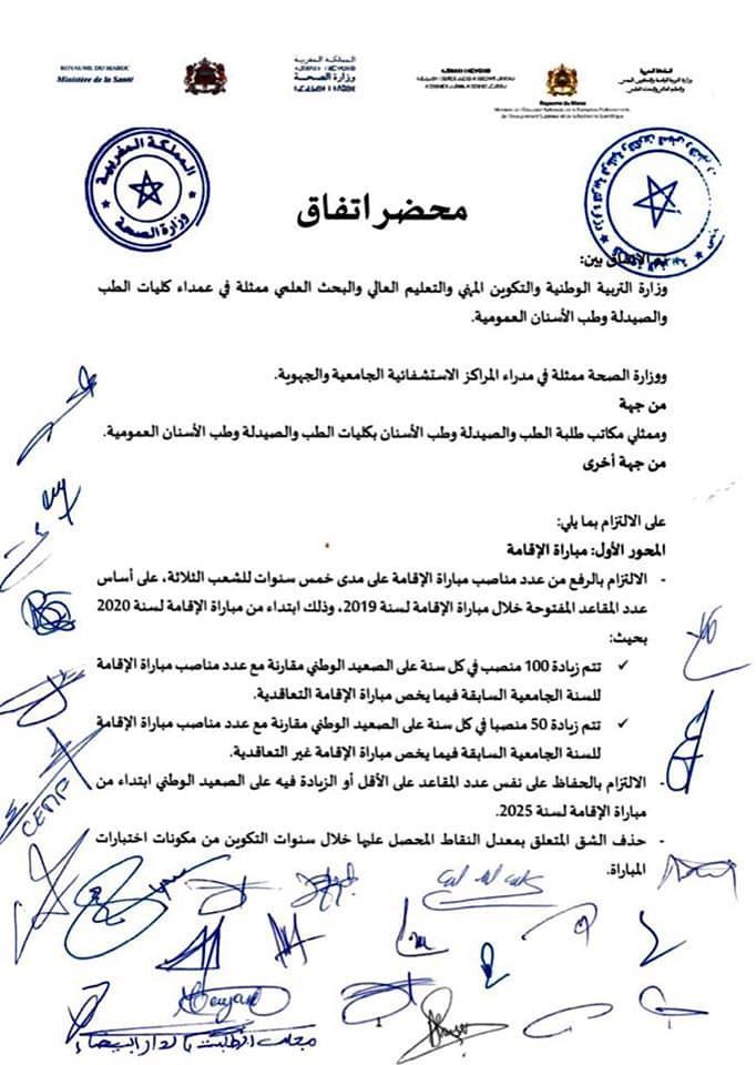 محضر اتفاق بين وزارة التربية الوطنية والتكوين المهني والتعليم العالي والبحث العلمي ، ممثلة في عمداء كليات الطب والصيدلة وطب الأسنان العمومية؛ ووزارة الصحة ممثلة في مدراء المراكز الاستشفائبة الجامعية والجهوية من جهة ، وممثلي مكاتب طلبة الطب وطب الأسنان بكليات الطب والصيدلة وطب الأسنان العمومية من جهة أخرى ، على الالتزام بما يلي،(انظر محضر الاتفاق أسفله):