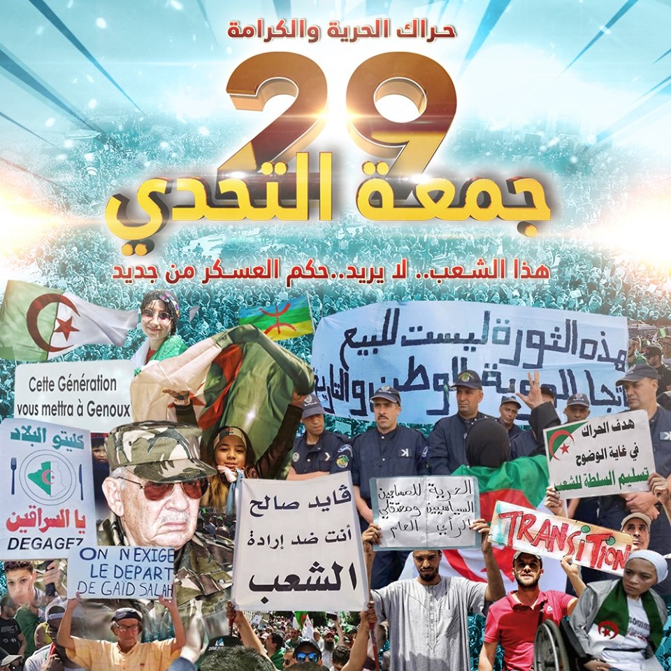 ما زال الحراك الشعبي بالجزائر يتصاعد من أسبوع لآخر ،خاصة في يوم الجمعة ؛ هذا اليوم الذي بلغ الدورة 29 ، منذ اندلاع مظاهرات الاحتجاج ضد النظام الحاكم بالجزائر ، يوم 22 فبراير 2019 التي نادى فيها الجزائريون برحيل النظام بجميع رموزه.