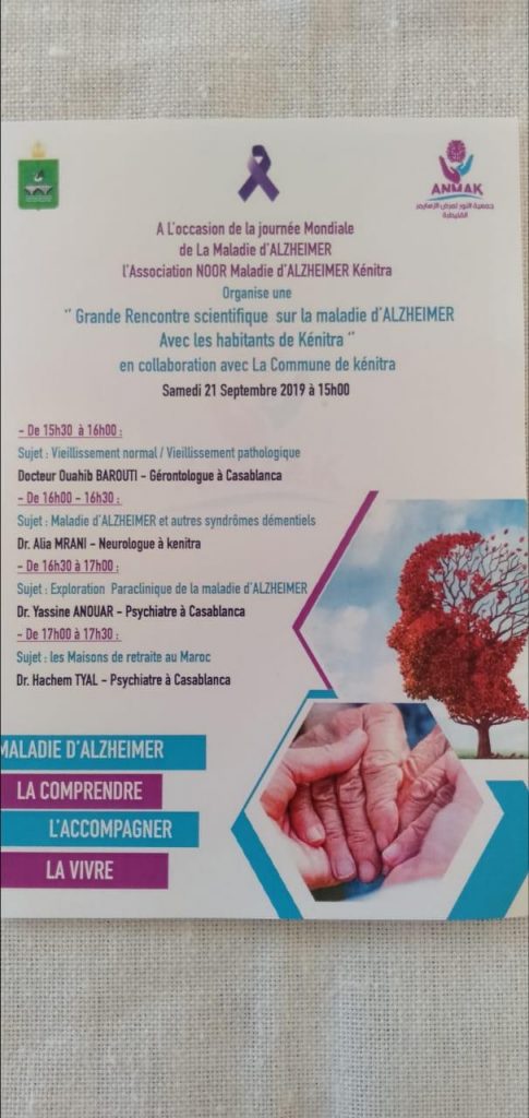 بمناسبة اليوم العالمي للزهايمر، تنظم جمعية النور لمرض الزهايمر بالقنيطرة يوما تواصليا مع سكان المدينة ،يوم السبت 21 شتنبر 2019، بالقاعة الكبرى لبلدية القنيطرة ، ابتداء من الساعة الثالثة بعد الزوال.