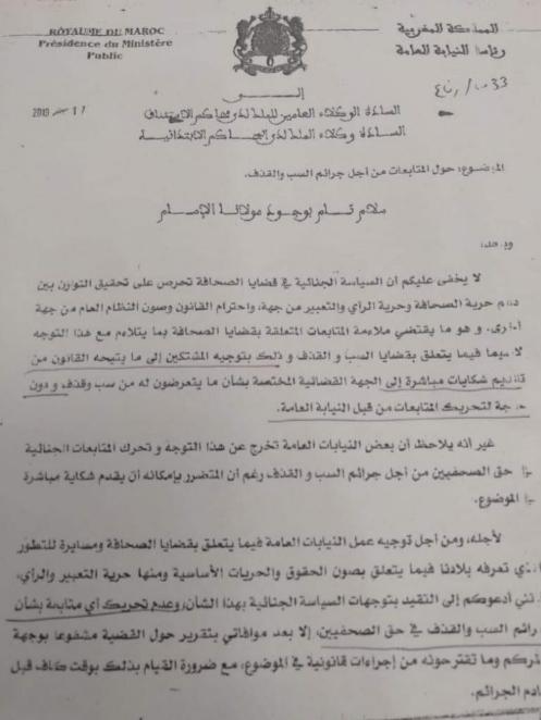 “لا يخفى عليكم أن السياسة الجنائية في قضايا الصحافة تحرص على تحقيق التوازن بين دعم حرية الصحافة وحرية الرأي والتعبير من جهة، واحترام القوانين وصون النظام العام من جهة أخرى، وهو ما يقتضي ملاءمة المتابعات المتعلقة بقضايا الصحافة بما يتلاءم مع هذا التوجه، لا سيما فيما يتعلق بقضايا السب والقذف ، وذلك بتوجيه المشتكين إلى ما يتيحه القانون من تقديم شكايات مباشرة إلى الجهة القضائية المختصة بشأن ما يتعرضون له من سب وقذف ، ودون حاجة لتحريك المتابعات من قبل النيابة العامة.”