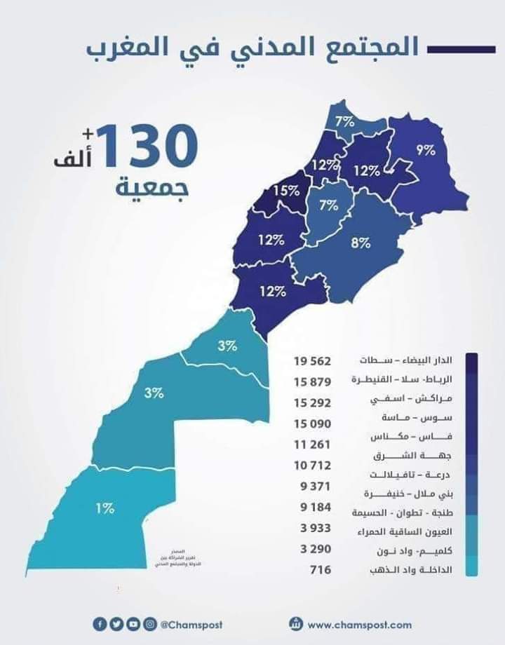 يبلغ عدد الجمعيات التي تمثل المجتمع المدني ،أو تنطق باسمه، في المغرب : 130 ألف جمعية موزعة على مختلف جهات المملكة.