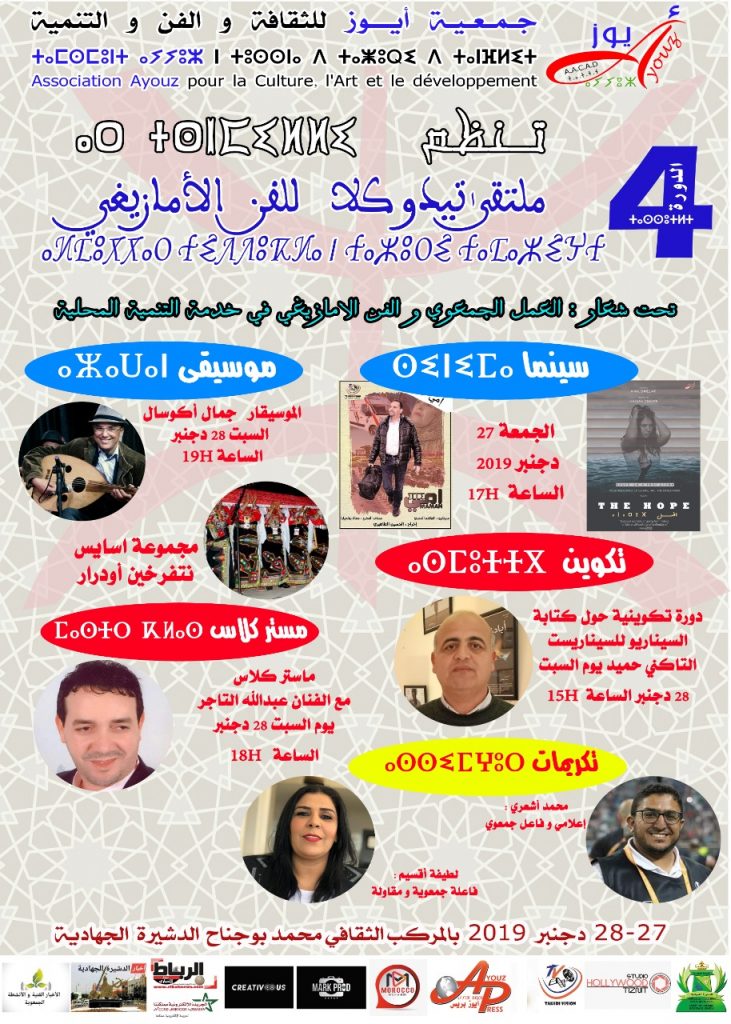 “العمل الجمعوي و الفن الامازيغي في خدمة التنمية المحلية ” يومي 28 / 27 دجنبر 2019 بالمركب الثقافي محمد بوجناح بالدشيرة الجهادية عمالة انزكان ايت ملول.