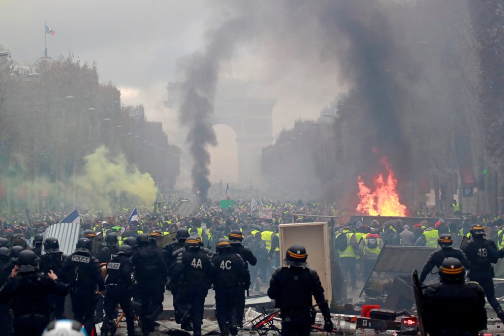 Protesters wearing yellow vests, a symbol of a French drivers' protest against higher fuel prices, run from police during riots on the Champs-Elysees in Paris, France, November 24, 2018. REUTERS/Gonzalo Fuentes