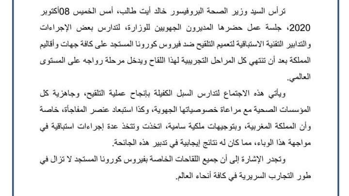 توضيح من وزارة الصحة حول عملية التلقيح ضد “كورونا”