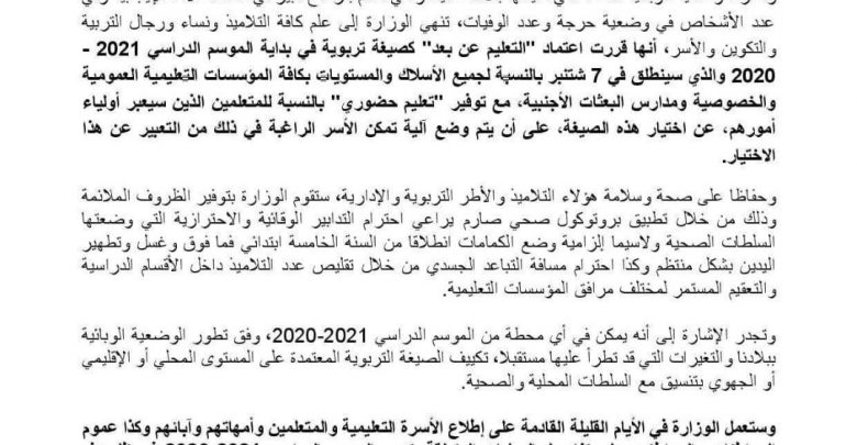 وزارة التربية تقرر اعتماد صيغة التعليم عن بُعْد في بداية الموسم الدراسي 2020 ـ 2021