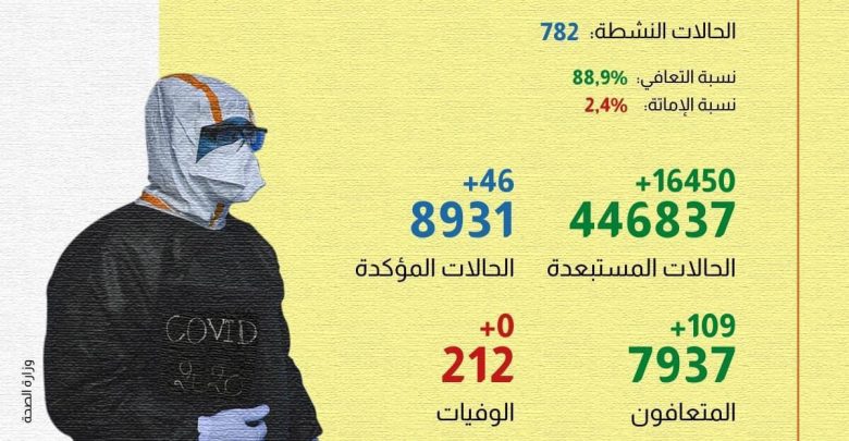 حصيلة فيروس كورونا:109 حالة شفاء ،صفر وفاة و46 إصابة جديدة