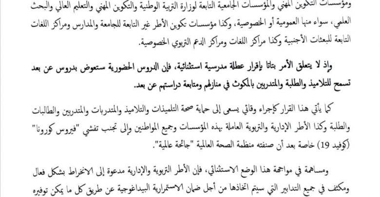 رسميا تعليق الدراسة بالمغرب ابتداء من يوم الإثنين 16 مارس 2020 حتى إشعار آخر