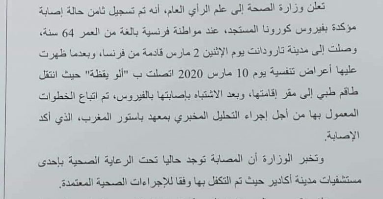 تسجيل ثامن حالة إصابة بفيروس كورونا المستجد بالمغرب