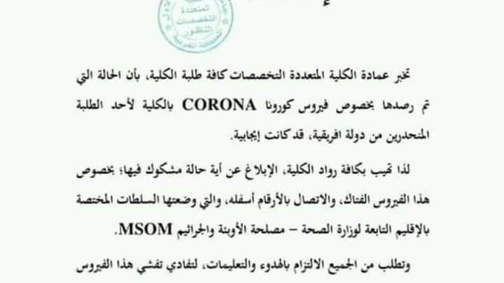 الناظور: الكلية المتعددة الاختصاصات تطلب من روادها الإبلاغ عن أية حالة حول “كورونا”