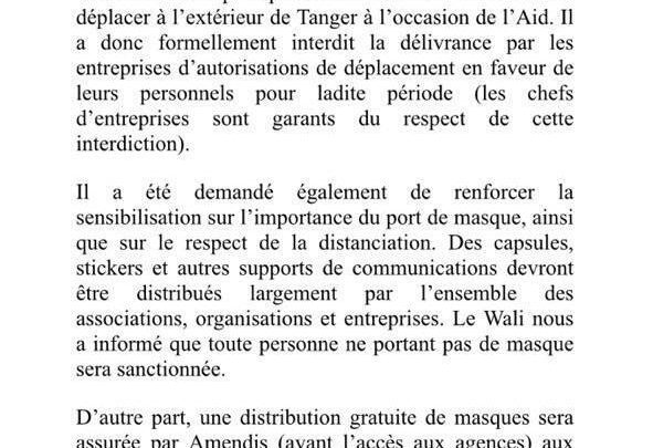 طنجة:منع التنقل خارج المدينة بمناسبة عيد الأضحى ولزوم وضع الكمامة الواقية